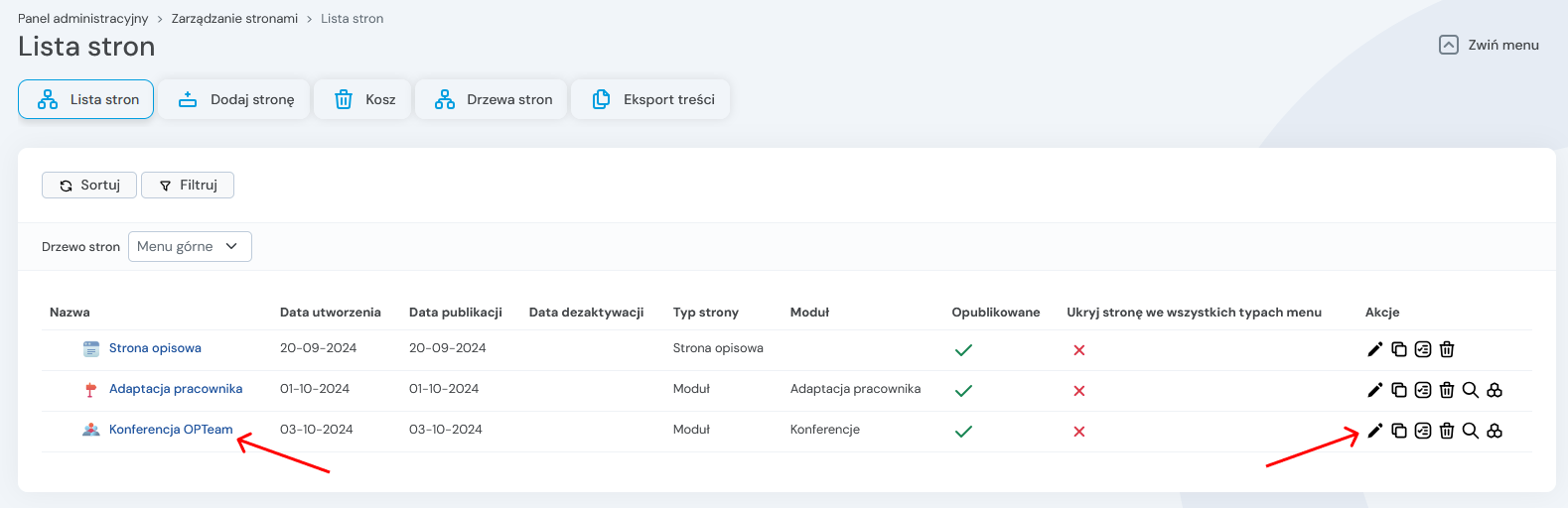- Formularza edycji strony, do którego dostęp odbywa się poprzez kliknięcie nazwy strony lub w ikonę